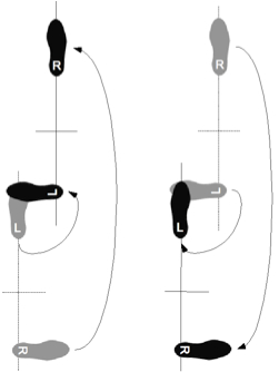 Vor (Abb. links): Hierbei wechselt der hintere Fuß nach vorne, während sich der andere an der Stelle bewegt. Hierbei drehen sich Hüfte und Schulter um 90°. Auch wird die Waffe auf die innere Seite (Bauchseite) mitgenommen. Dieser Schritt solle nicht in vertikaler Richtung auf den Körper übertragen werden. In der Regel verlagert sich die eigene Gefechtslinie (Standlinie) um eine Fußlänge. Der Wechselschritt begleitet viele Techniken und verleiht ihnen die nötige Energie.